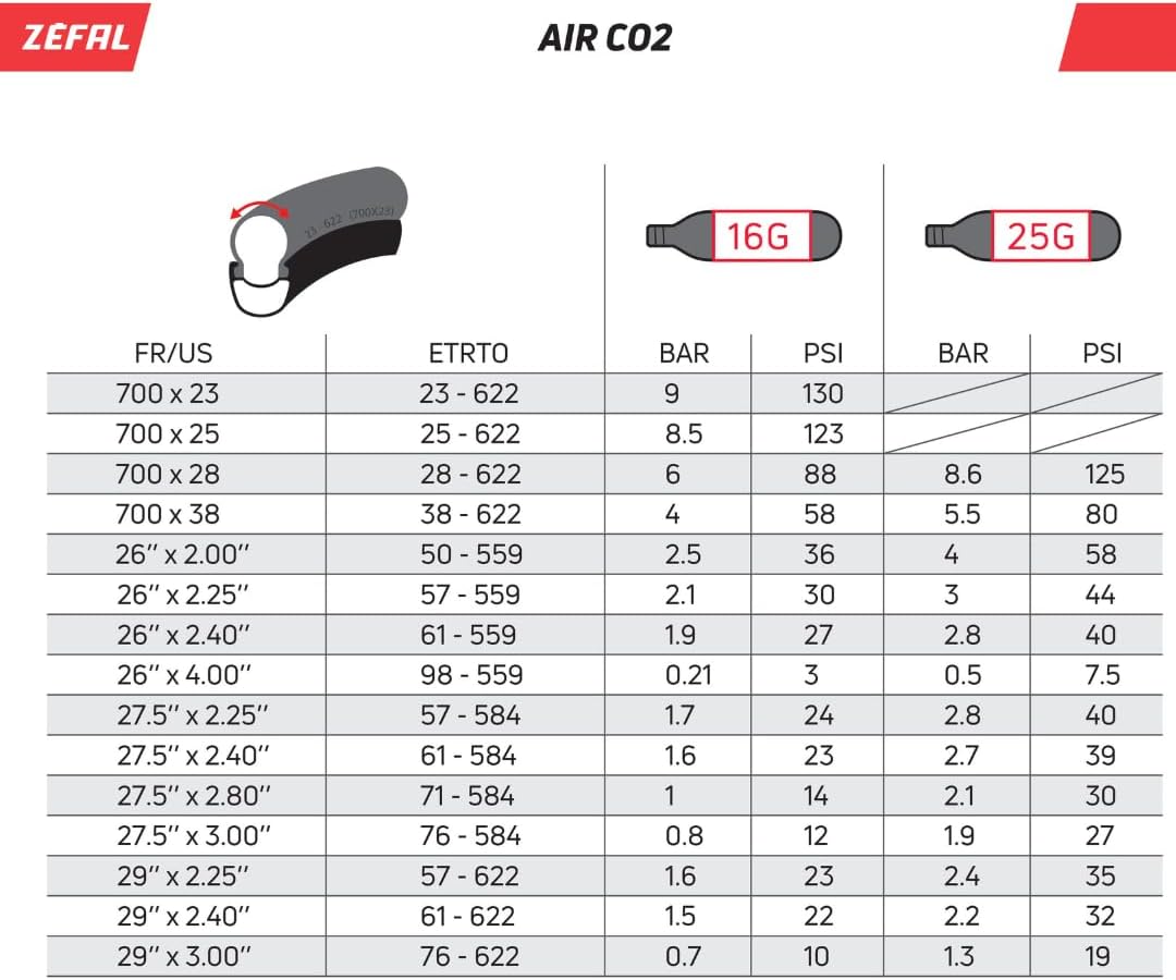 Regla práctica: si ruedas sobre todo carretera, lleva 16 g (dos cartuchos por si acaso). Si haces gravel 40–45 mm, considera 16–20 g según tu presión objetivo. Para MTB, parte de 20–25 g. Si usas tubeless, el volumen interno y la absorción del sellante hacen especialmente útil el cartucho “un poco mayor” para sellar y asentar el talón rápido.